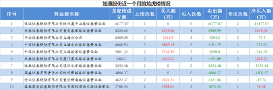 通过追踪如通股份近一个月的龙虎榜成交记录,记者发现前十成交额的营业部基本都被市场认为是温州帮的席位。而温州帮第一次介入该股,最早要追溯到去年的12月28日,温州帮三个席位开始买入,其中最著名的席位便是中信证券上海溧阳路营业部,但随后次新股因为IPO提速,板块整体大跌,温州帮被迫潜伏在里面,直到消化了利空,站稳反弹,随后如通股份开始了波澜壮阔的涨势,股价一度涨至51块,涨幅超过100%。