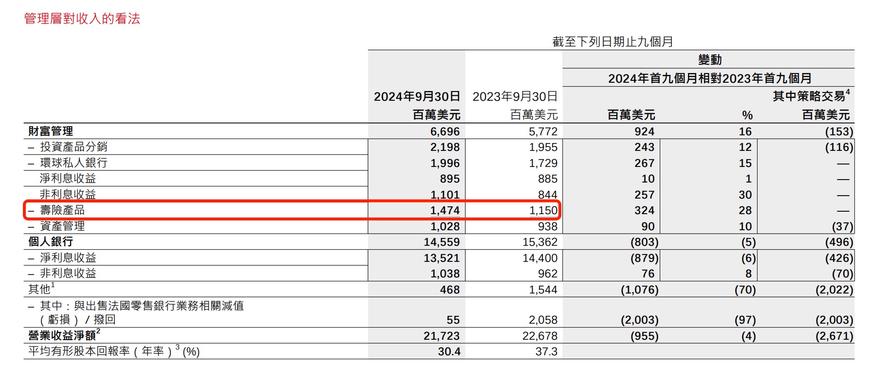 今年前9个月,汇丰控股的寿险业务收入为14.74亿美元,较去年同期的11.50亿美元增长了3亿美元。当中包括来⾃合约服务收益拨回的盈利增⻑,⼤部分是合约服务收益结余持续增加所致。制订保险产品的新业务合约服务收益为21亿美元,较2023年⾸九个⽉增加58%,主要来⾃香港多个法律实体。