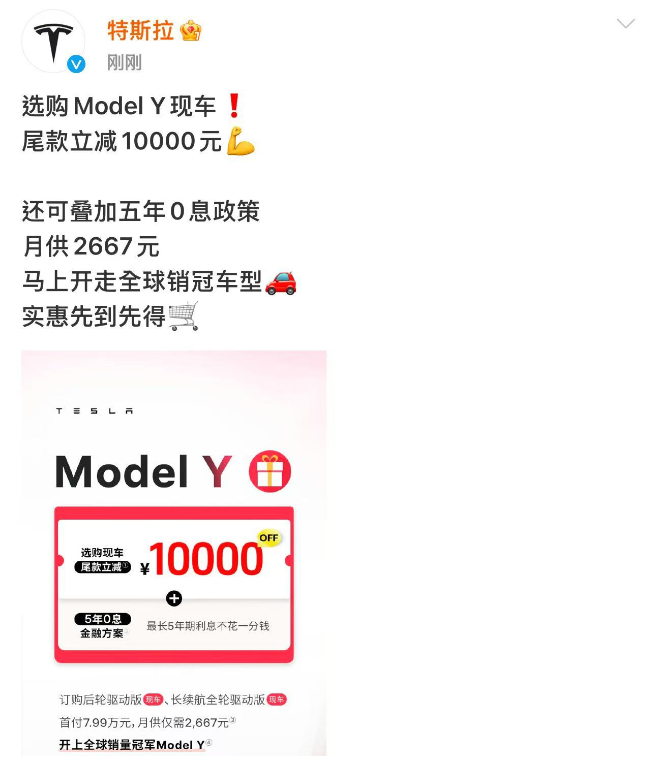 特斯拉微博12月24日消息,选购Model Y现车,尾款立减10000元。