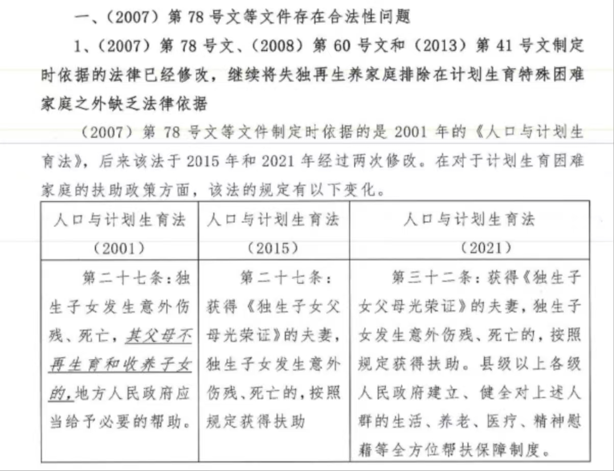 《请求书》指出,2007年制定“78号文件”时,依据的是2001年的《人口与计划生育法》,当时该法将计划生育困难家庭扶助范围划定在“父母不再生育和收养子女的”人群。然而,2015年和 2021年《人口与计划生育法》两次修改后,“父母不再生育和收养子女”的条件已被删除。这意味着,继续将失独再生养家庭排除在扶助政策之外,已失去法律依据。