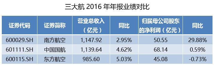 3月30日晚间,南方航空(600029.SH)、中国国航(601111.SH)、东方航空(600115.SH)悉数披露了2016年年报。年报显示,三家公司分别在报告期各实现营业收入1147.92亿元、1139.64亿元和985.60亿元,同比增长2.95%、4.62%和5.03%;报告期实现归属母公司股东的净利润50.55亿元、68.14亿元和45.08亿元,同比增长29.88%、0.59%和-0.73%。