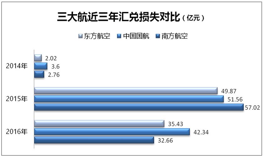 在2016年人民币兑美元汇率贬值6.39%之下,三大航汇兑损失依然超过110亿元。年报显示,南方航空、中国国航、东方航空2016年汇兑损失分别为32.66亿元、42.34亿元和35.43亿元,同比下降42.72%、17.88%和28.96%。