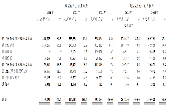 2021年至2023年及2024年上半年(报告期),卓越睿新的收入分别为4.17亿元、4.00亿元、6.53亿元和2.41亿元,目前来看公司60%以上收入来自数字化课程业务。