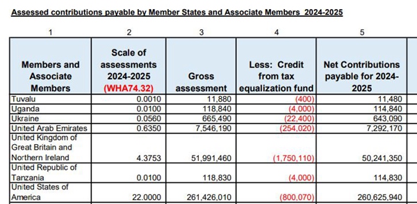 世卫组织的财政预算为双年度预算,2024-2025年的总预算为68.34亿美元。根据这一时期的分摊会费比例报告,美国的会费将占总会费的22%约2.6亿美元,中国以15.255%排名第二。