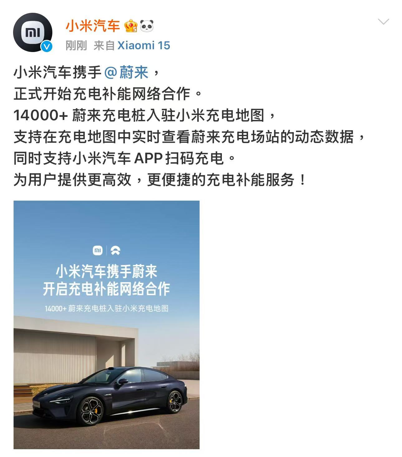 小米汽车官方微博12月25日消息,小米汽车携手蔚来,正式开始充电补能网络合作。14000+蔚来充电桩入驻小米充电地图,支持在充电地图中实时查看蔚来充电场站的动态数据,同时支持小米汽车APP扫码充电。