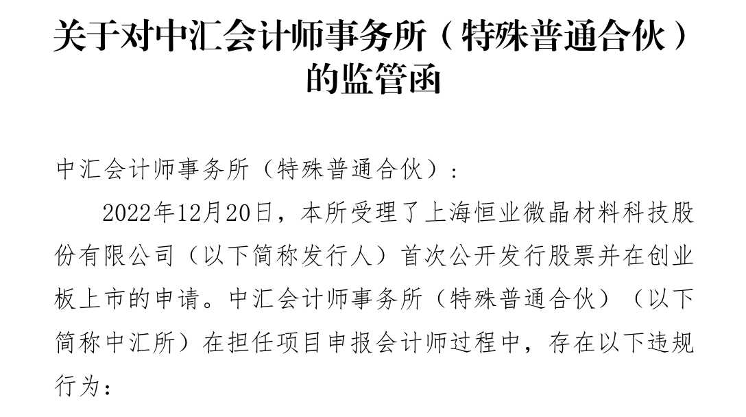 12月20日,恒业微晶的会计师事务所、律所被深交所点名。其中,国浩律师(上海)事务所、项目签字律师余蕾和毛一帆收监管函;中汇会计师事务所(特殊普通合伙)收监管函,签字注册会计师谢贤庆、陆加龙、汪宇被通报批评。
