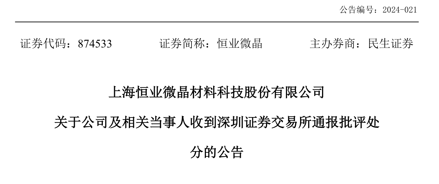 恒业微晶表示,上述纪律处分决定不会影响公司整体的正常运营,不会对公司经营产生重大不利影响。