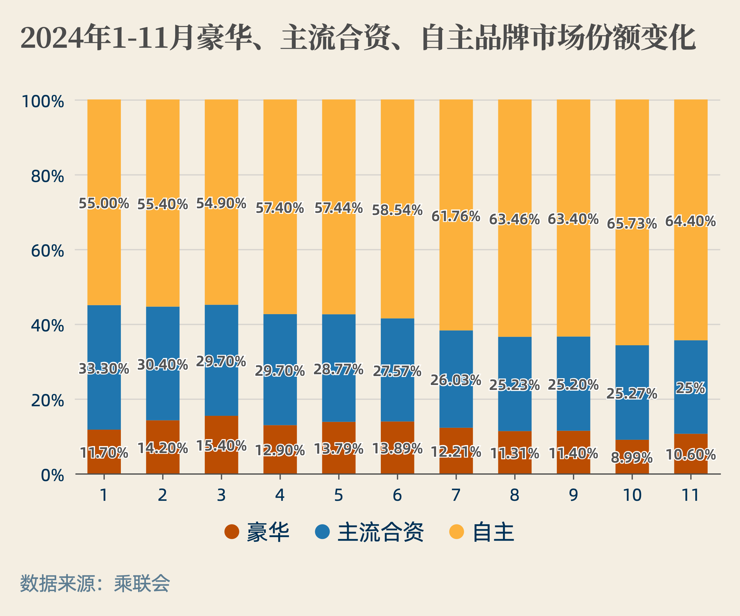 自主品牌的市场份额从年初的55%上升为64.4%,主流合资品牌相应的从年初的三分之一下降为四分之一。豪华品牌的份额下滑虽不显著,但也在10月份时一度跌至9%。