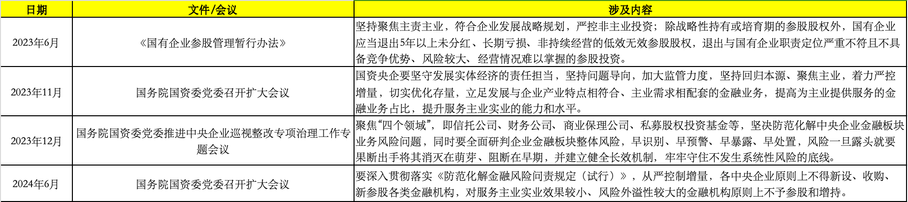 去年以来,一系列指导文件/会议确定了央国企聚焦主责主业,严控非主业金融风险的整体发展思路。