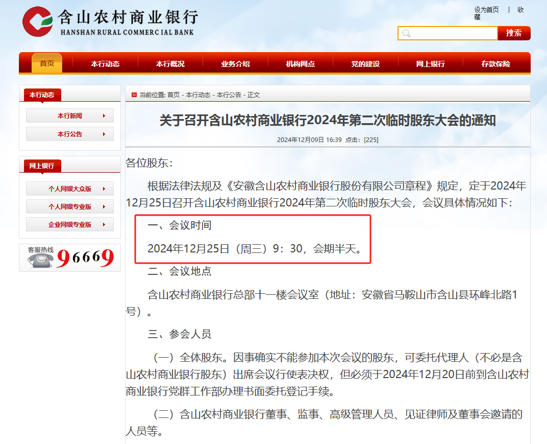 11月13日,安徽含山农村商业银行召开2024年第一次临时股东大会,审议《关于同意吸收合并并启动安徽含山农村商业银行股份有限公司吸收合并含山惠民村镇银行有限责任公司工作的议案》。
