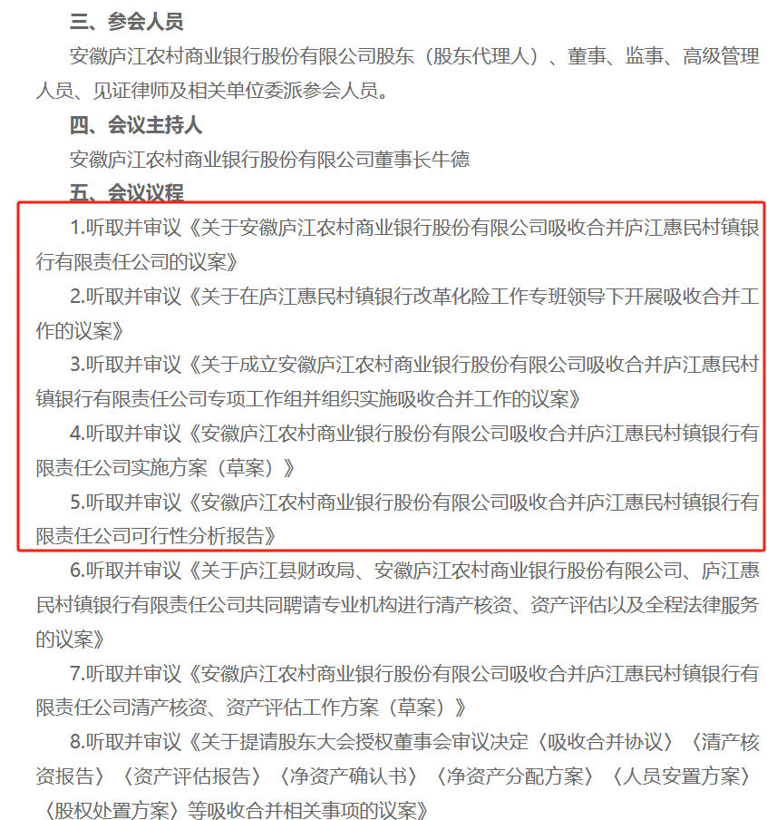 其次,吸收合并含山惠民村镇银行和庐江惠民村镇银行,安徽含山农村商业银行和庐江农村商业银行1个月前已分别召开第一次股东大会。