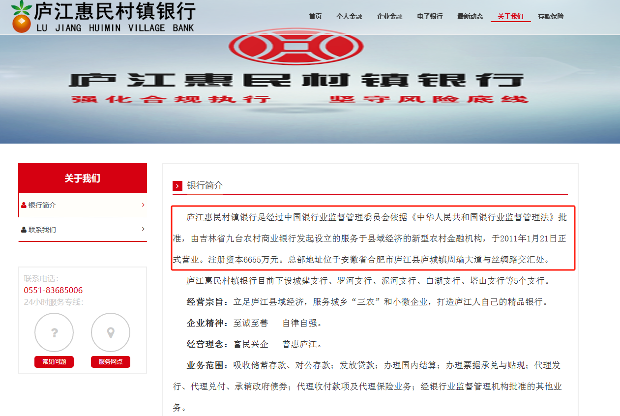 根据庐江惠民村镇银行官网显示,庐江惠民村镇银行是经中国银行业监督管理委员会批准,也是由东北首家农村商业银行吉林省九台农村商业银行发起设立的服务于县域经济的新型农村金融机构,2011年1月21日正式营业。