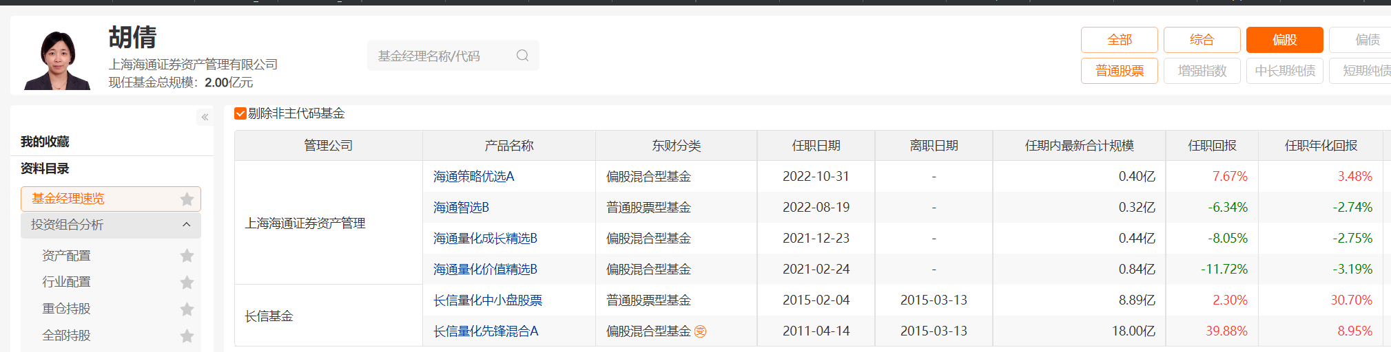 Wind数据显示,共同管理者胡倩,在管产品4管3亏(剔除非主代码基金)。截至2024年12月26日,任职回报最高的为海通策略优选,达7.67%;海通量化价值精选任职回报跌超11%。