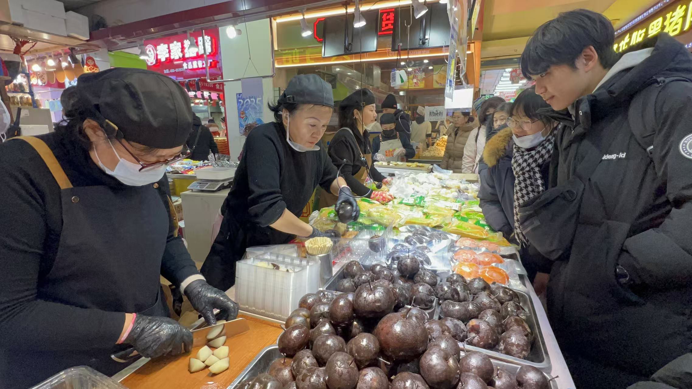 “现切冻梨,即买即食!”在哈尔滨道里菜市场此起彼伏的叫卖声中,现切冻梨的吆喝声极具穿透力,即买即食的便利让许多游客当即付款。“你吸一口汁,再咬一口果肉,那肉可哏啾了!”在老板齐德红的示范下,广东游客陈睿终于品尝到了心心念念的东北冻梨,“哇,靓!”吃过一口后,还在绵绵回味中给出了中肯评价。
