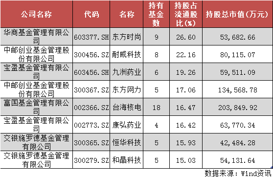 从上表可以看到,共有8只个股的持股占流通股比超15%,包括东方时尚(603377.SH)、耐威科技(300456.SZ)、九洲药业(603456.SH)、东方网力(300367.SZ)、台海核电(002366.SZ)、康弘药业(002773.SZ)、恒华科技(300365.SZ)、和晶科技(300279.SZ)等。