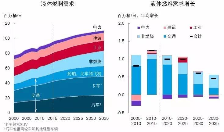 总体来讲,在展望期间,由于新兴经济体的中产阶级对汽车通行需求的增加,将让汽车对液体燃料的需求增加400万桶/日(同2015年相比增加约20%)。