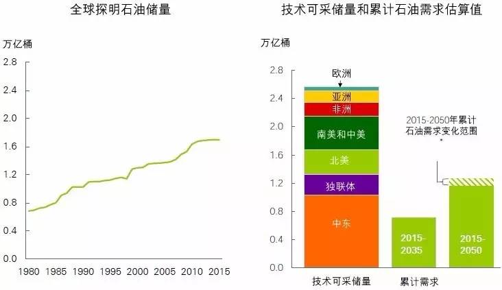 在过去50年时间,出于对石油资源枯竭的担忧,石油供应峰值论盛行。随着北美页岩油、巴西深水石油、加拿大油砂以及北极石油资源勘探开发的发展,这样一种担忧正在退热。《展望》也指出,目前已探明的可采石油储量,足够用到2050年。
