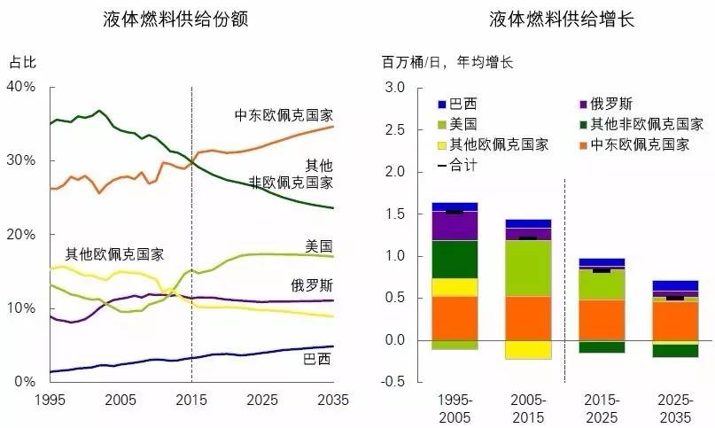 《展望》预测,未来新增的石油供给量,主要来自低成本生产者。到2035年,70%的新增石油供应量将来自于OPEC。未来全球的三大石油产区将是中东OPEC国家、美国和俄罗斯。中东OPEC国家、俄罗斯和美国三大石油产区,在全球液体燃料供应中的份额将从2015年的56%增加到2035年的63%。