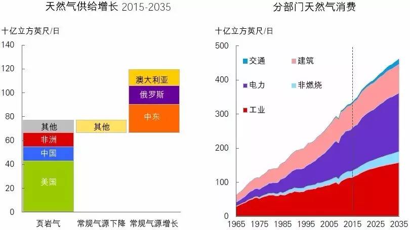 《展望》预测天然气消费增速将高于石油和煤炭。到2035年,页岩气将占全球天然气供给量的1/4(主要受到美国驱动)。届时,中国将成为世界第二大页岩气生产国。而常规天然气产量增加的三大中心是中东、俄罗斯、澳大利亚。