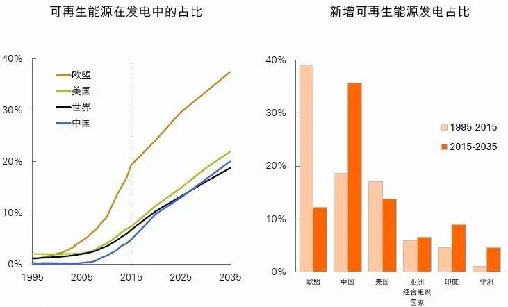 《展望》预测,在发电领域,可再生能源预计将是增长最快的能源(年均7.6%),在全球发电中的份额会从2015年的7%升至2035年的20%左右。中国将是未来20年可再生能源最大增长国,其增量超过欧盟和美国的总和。
