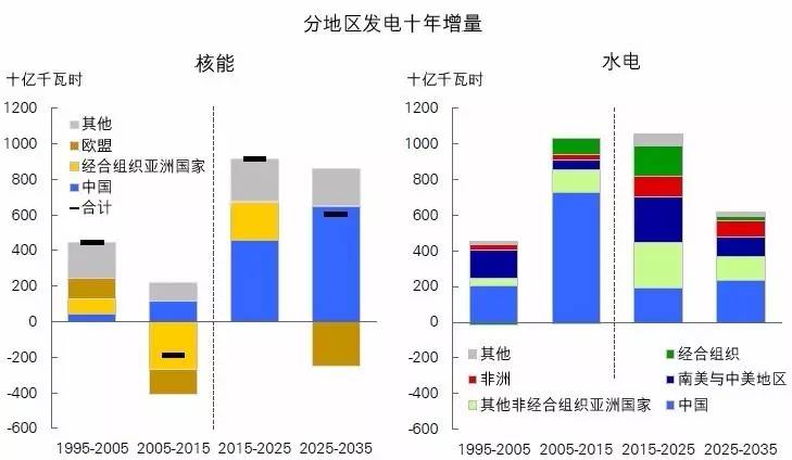核电和水电的发电量预计在展望期内稳步增长,年均增速分别为2.3%和1.8%。全球新增核发电量的3/4将来自中国,中国的水力发电量增长相比过去十年将大幅放缓。