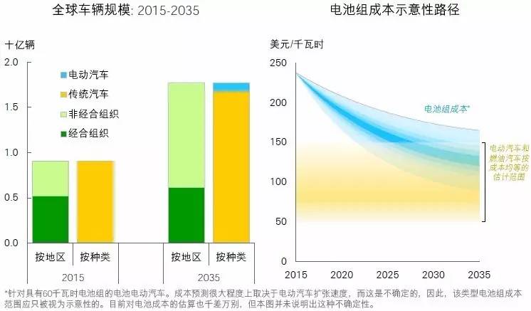 《展望》基本情景预测,全球汽车的数量将增加一倍,从2015年的9亿辆升至2035年的18亿辆。其中电动车从2015年的120万辆升至2035年的1亿辆左右(仅占全球汽车总量的6%),但电动车之中有1/4是电油混合型的汽车。电动车虽然减缓了石油需求增长,但影响并不大。