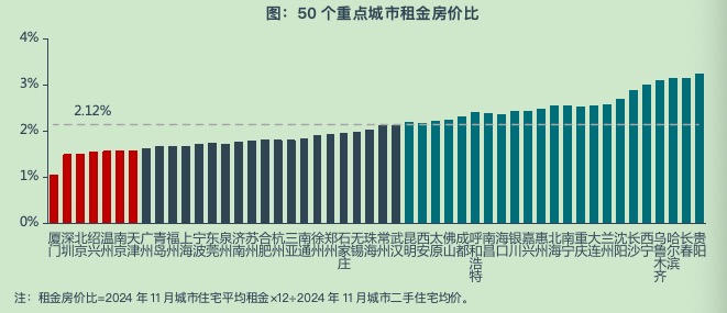 据中指研究院数据,2024年11月50个重点城市租售比为2.12%,较2022年末上升0.14个百分点。从绝对水平来看,截至2024年11月,厦门、深圳、北京租售比仍较低,不足1.5%;而广州、上海逐步向2%靠拢,重庆、长沙等二线城市租金房价比已接近3%,哈尔滨、长春等已超过3%,其中贵阳最高,为3.22%。
