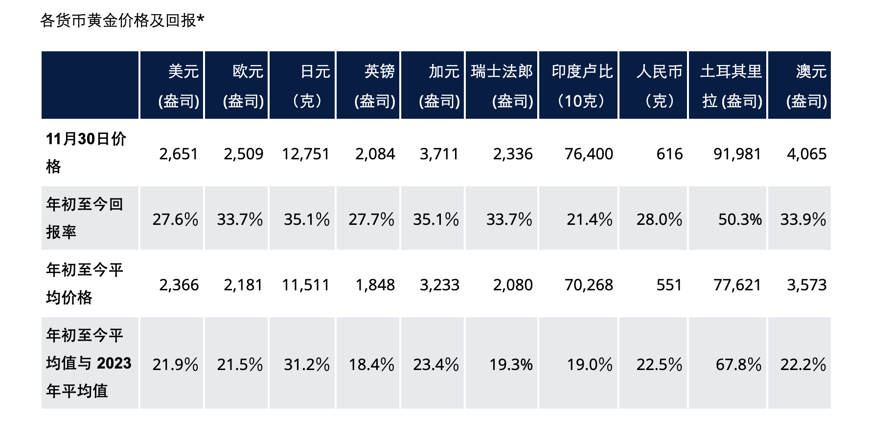 截至12月28日,COMEX黄金即纽约金报收2635.37美元/盎司,较年初上涨约30.6%,年内最高涨至2801.8美元/盎司;国内沪金报收616.84元/克,较年初上涨了约27.9%,年内最高涨至639.48元/克。