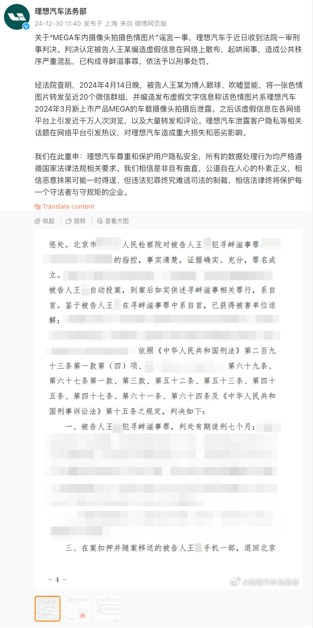 12月30日,理想汽车法务部发文称,关于“MEGA车内摄像头拍摄色情图片”谣言一事,理想汽车于近日收到法院一审刑事判决。判决认定被告人王某编造虚假信息在网络上散布,起哄闹事,造成公共秩序严重混乱,已构成寻衅滋事罪,依法予以刑事处罚。