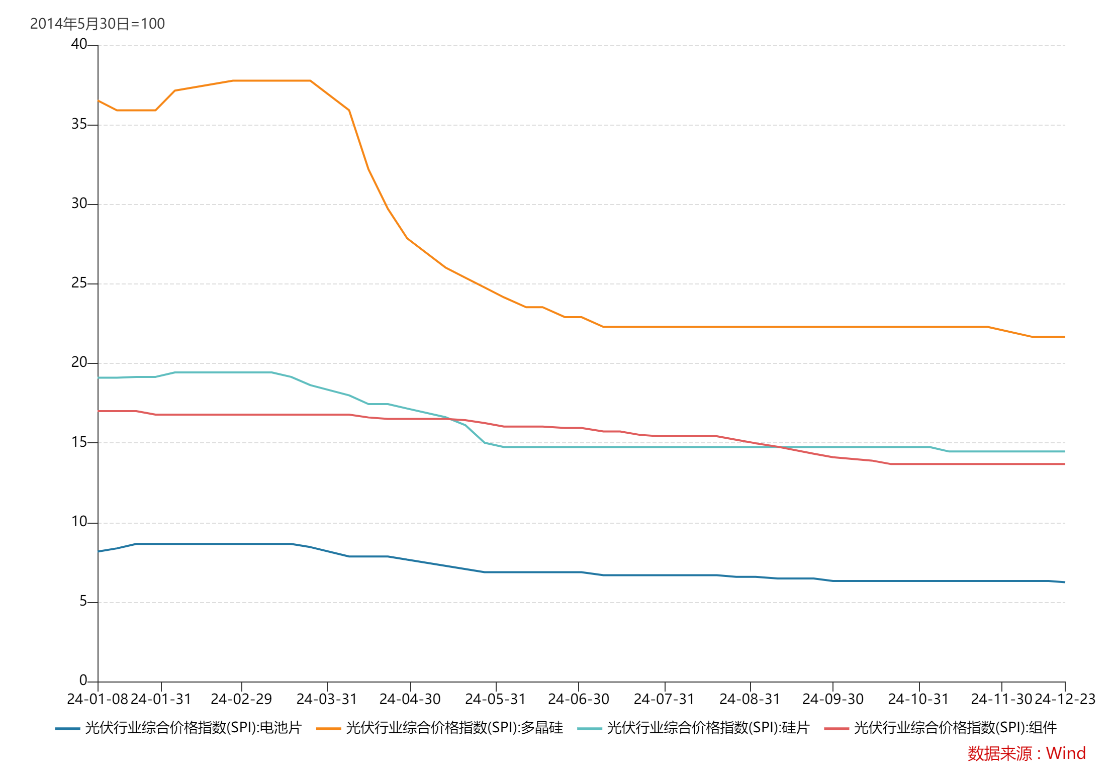 此前产业链最为强势的硅料跌幅最为剧烈,创出阶段新低。截至12月底,光伏多晶硅综合价格指数已跌至21.67,相较年初的36.53大跌41%,跌幅位居四大环节之首。