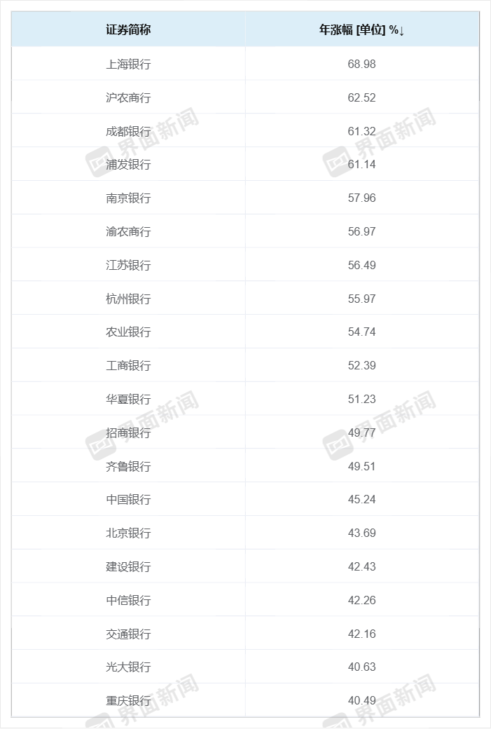 从板块表现来看,A股银行板块涨幅达42.84%,在30个中信一级行业中排名第一。个股中,11家银行涨幅超50%,其中,上海银行、沪农商行、浦发银行、成都银行涨幅超过60%。