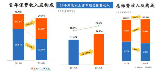 新华保险2016年首年期交业务236.85亿元,同比增长41.3%,首年期交占新单的比例提升17个百分点至49.7%;从年期结构上看,十年期及以上首年期交保费收入141亿元,同比增长23.2%,十年期及以上期交业务占首年期交的比例为59.7%;续期业务648.81亿元,止跌回升,增长9.0%,续期保费在总保费中的占比提高到57.6%。与之对应的是,趸交业务按计划减少117亿。