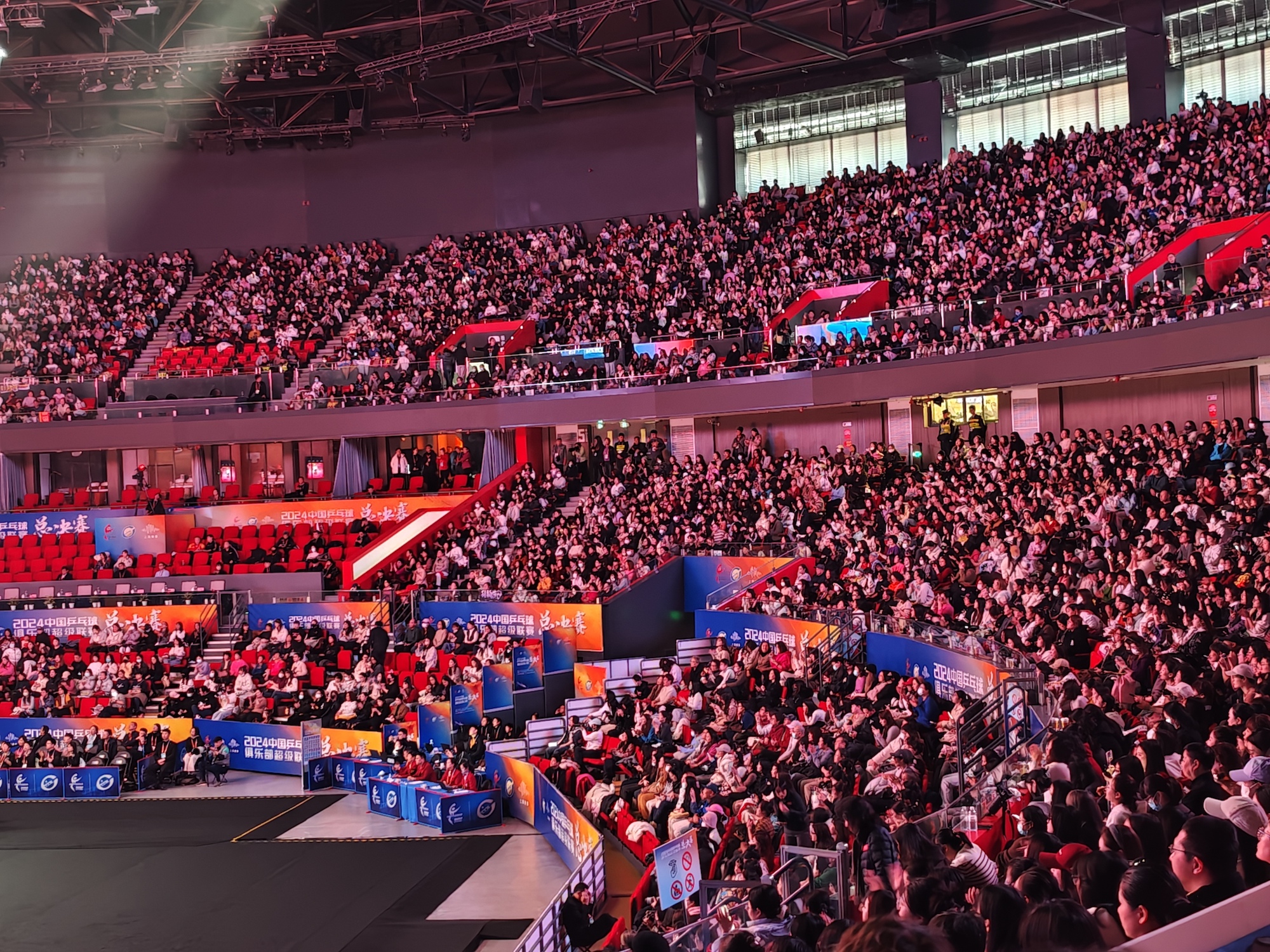 乒超联赛在总决赛阶段来到上海,再加上汇集了樊振东、孙颖莎、王楚钦、王曼昱等一众国手,赛事在2024这个奥运年的末尾收获了来自观众极大的观赛热情。界面新闻记者在现场看到,三个比赛日,现场上座率均超九成。在国手们出场的关键场次,现场更是座无虚席。观众中有不少还是拎着大包小包远道而来的外地球迷。