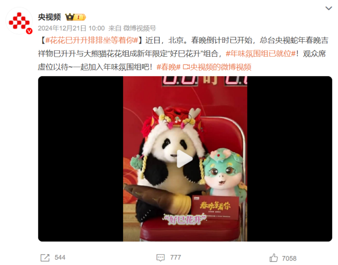 近期,广电总台官宣《2025年春节联欢晚会》主题以及吉祥物“巳升升”官宣,并且随着春晚倒计时开始,巳升升与大熊猫花花组成限定组合,#花花巳升升排排坐等着你#等话题也火上了微博热搜。