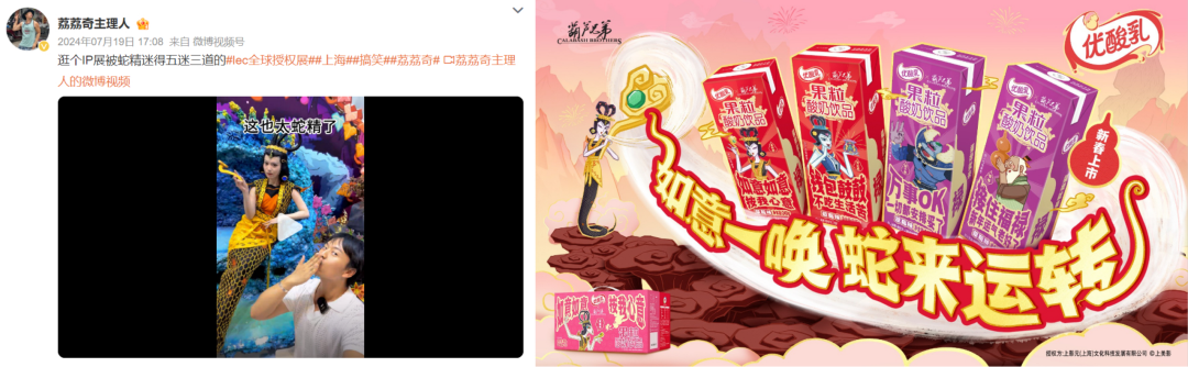 上周,由上影元文化授权,优酸乳联名《葫芦兄弟》,携蛇精姐妹推出蛇年新春包装,标志着童年经典动画形象“蛇精”,也正式加入了蛇年IP营销的行列。