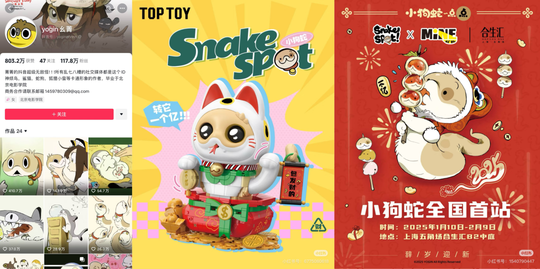 近一个月内,小狗蛇点点IP已经陆续官宣了与TOPTOY合作的“新春招财瑞献积木”,与北京一卡通的2025年“蛇年文创交通卡”,还有与追觅扫地机、太二酸菜鱼、卡盟文创等品牌联名的周边产品;A股上市的齐心集团也已与“小狗蛇”开展IP联名合作,上市产品包括红包、台历、春联套装、文具礼袋套装等,目前已在京东、天猫和抖快直播间和小红书等渠道上架销售。此外,小狗蛇点点的首个线下快闪也将于春节期间在上海合生汇落地。