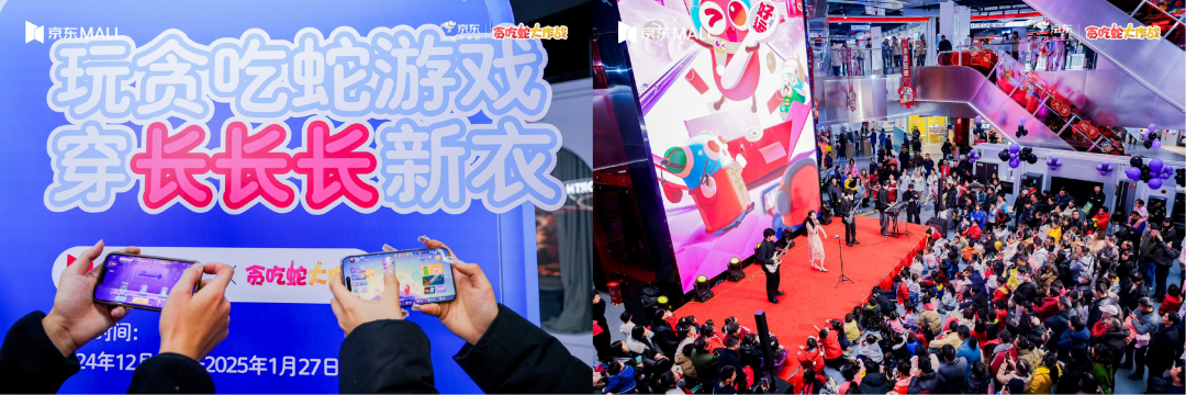 因此,原本就凭借独特的营销赛道为消费者熟知的情况下,蛇年成了贪吃蛇的“主场”。偷玩TOWANT联合贪吃蛇大作战推出蛇年毛绒系列联名周边,并在偷玩电商、名创优品、九木杂物社等潮流零售品牌内上线;线下活动方面,京东和《贪吃蛇大作战》的“新年狂欢趴”从2024年12月31日开始,并将持续到2025年1月27日。