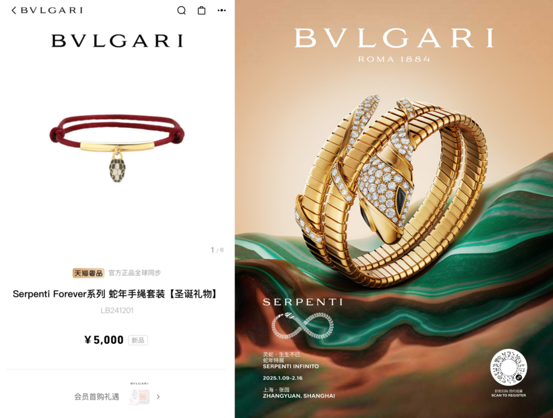 以宝格丽等品牌为例,很多品牌都赶上了这次的蛇年营销快车。宝格丽的蛇年限定手绳就将蛇元素与吉祥的寓意结合,配合相关平台KOL“带蛇招财”的推广下吸引了很多消费者。据悉,宝格丽“灵蛇·生生不已”蛇年特展也即将在2025年1月9日至2月16日于上海张园举办,主题是“万物相连,生生不已”,将蛇的寓意进行了更独特的解读。