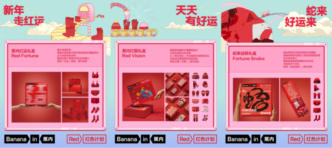 除了“一本难求”的故宫日历,服饰品牌蕉内也是一个可以参考的案例,其在11月开启品牌“红色计划”,并以“蛇来运转”为主题,联合艺术家朱敬一以及新锐国潮艺术家Fansack推出了“红运礼盒”“红图礼盒”“蛇来运转礼盒”,将实用商品附带上文化元素,提升了产品附加值。