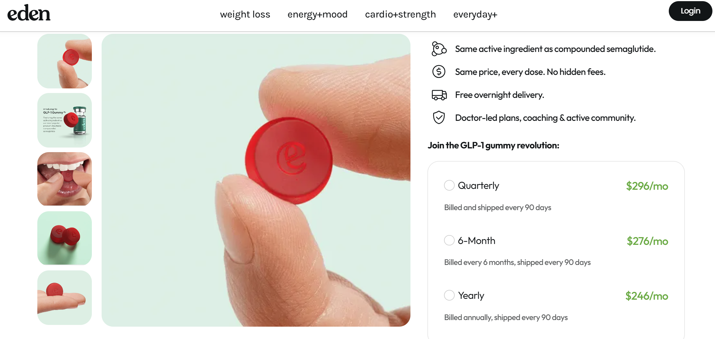 据Eden官网信息,司美格鲁肽咀嚼软糖目前包括三种购买方式——296美元/月的季度套餐、276美元/月的半年套餐、246美元/月的一年套餐。这也意味着,对于消费者而言,若是选购使用时间更长的套餐,则其每月的花销也会更便宜。