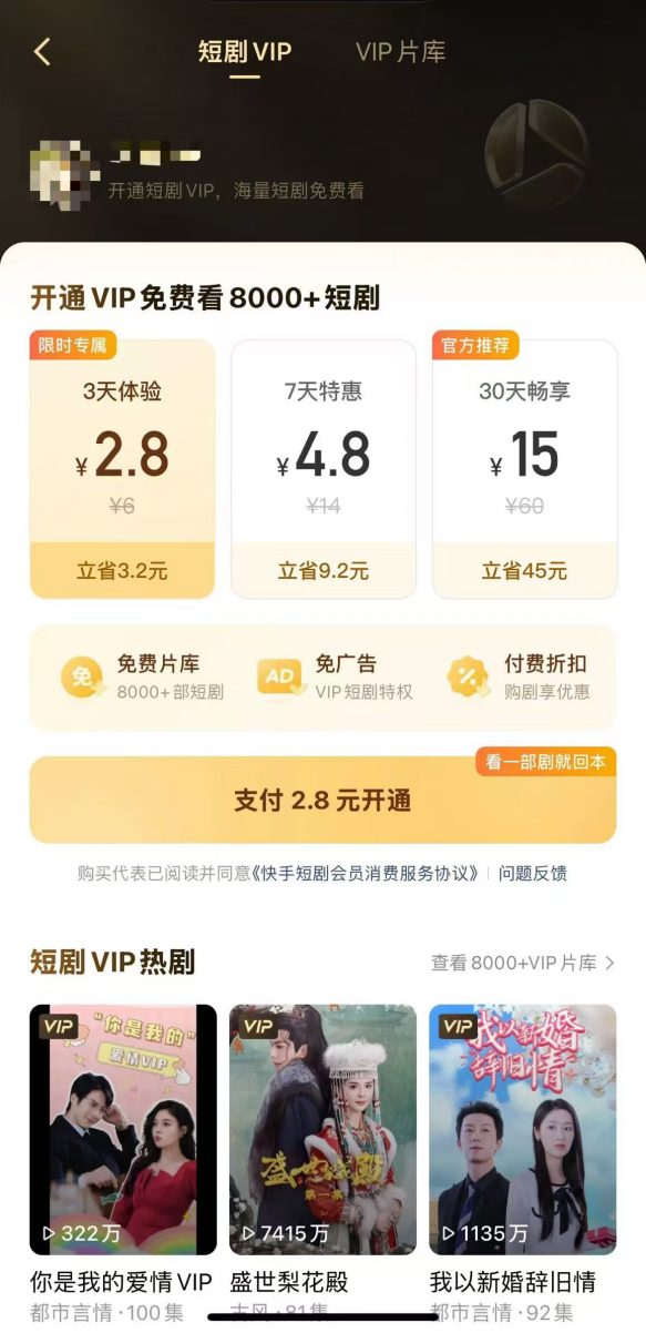 最近,快手向短剧合作方推出了全新的商业变现模式,即付费短剧会员。快手用户开通会员后可以在对应期限内免费观看8000+部短剧,3天、7天、30天的会员卡优惠后价格为2.8元、4.8元、15元。