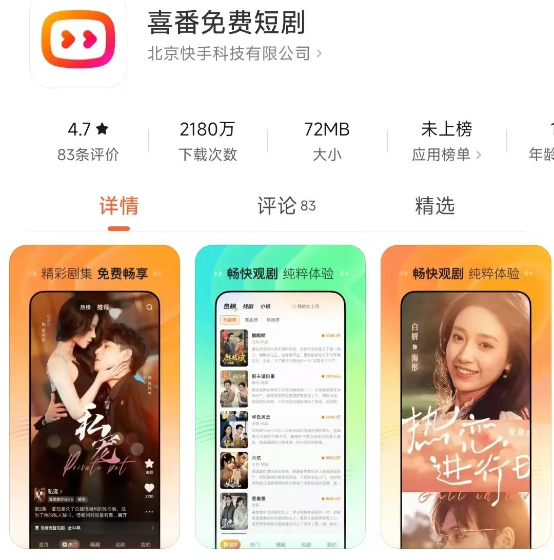 而快手旗下的免费短剧喜番App在2023年12月上线。据公开信息,喜番在2024年11月的月活跃用户数仅为309万,且目前该应用仅上线了应用宝和小米应用商店,并未推出IOS版本。