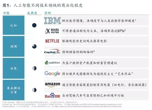 人工智能技术通常由四个部分组成,即认知、预测、决策和集成解决方案。认知是指通过收集及解释信息来感知并描述世界,包括自然语言处理、计算机视觉和音频处理等技术。预测是指通过推理来预测行为和结果。举例而言,此类技术可用来制作针对特定顾客的定向广告。决策则主要关心如何做才能实现目标。这一领域的用例十分广泛,如路线规划、新药研发、动态定价等。最后,当人工智能与其他互补性技术(如机器人)结合时,可生成多种集成解决方案,如自动驾驶、机器人手术,以及能够对刺激做出响应的家用机器人等。目前人工智能各项技术的商业化水平参差不齐。认知和预测领域的许多技术已经逐步商业化,然而决策和集成解决方案技术多处在研发阶段(见图1)。