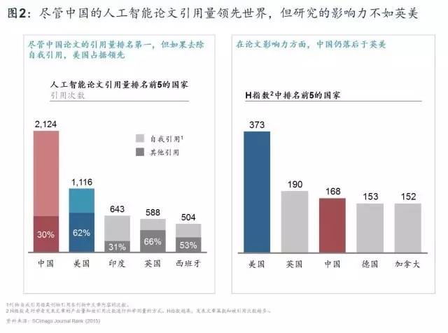 但是,中国需要持续不断的努力,才能保持人工智能的领先地位,并且最大化其经济潜能。发展创新能力是重中之重。虽然中国在人工智能的论文数量方面超过了美国,但中国学者的研究影响力尚不及美国或英国同行(见图2)。
