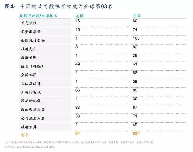 正如人类需要从食物中获得能量,人工智能的“食物”则是稳定的数据流。人工智能系统必须通过大量的数据来“训练”自己,才能不断提升输出结果的质量。但数据领域的几个因素可能会影响中国人工智能的发展。首先,尽管中国的科技巨头能够通过其专有平台获得海量数据,但在创建一个标准统一、跨平台分享的数据友好型生态系统方面,中国仍落后于美国。其次,全球各国都已意识到开放政府数据库有助于促进私营领域创新,但中国政府数据的开放度仍极为有限(见图4)。最后,对跨境数据流通的限制也使得中国在全球合作中处于不利地位。
