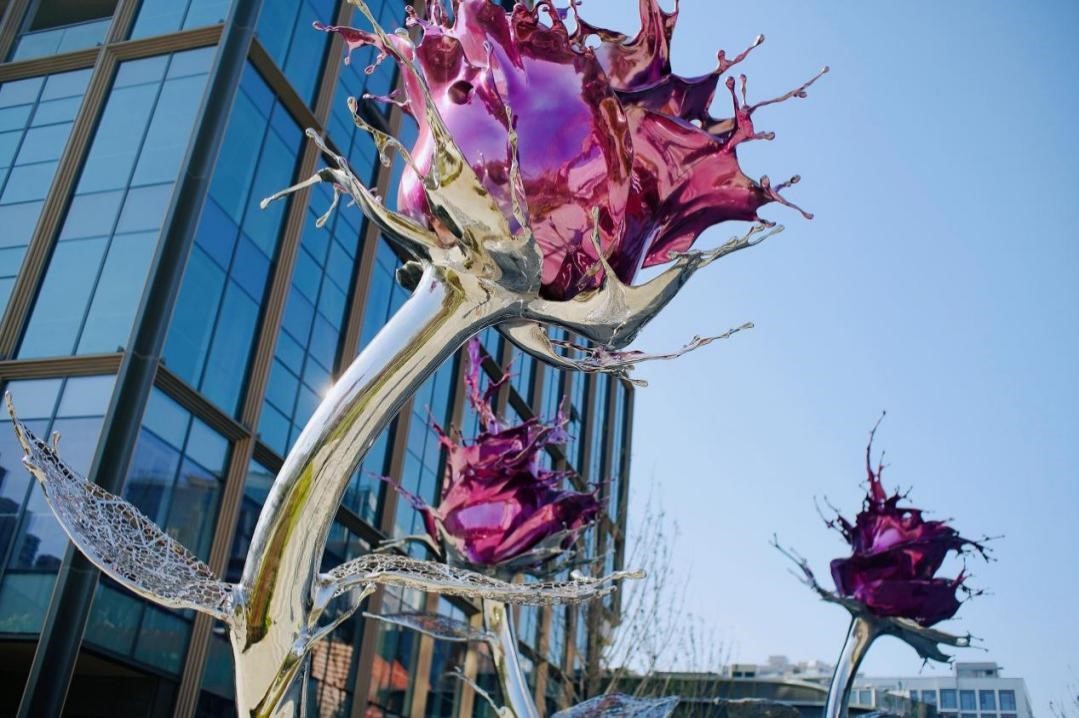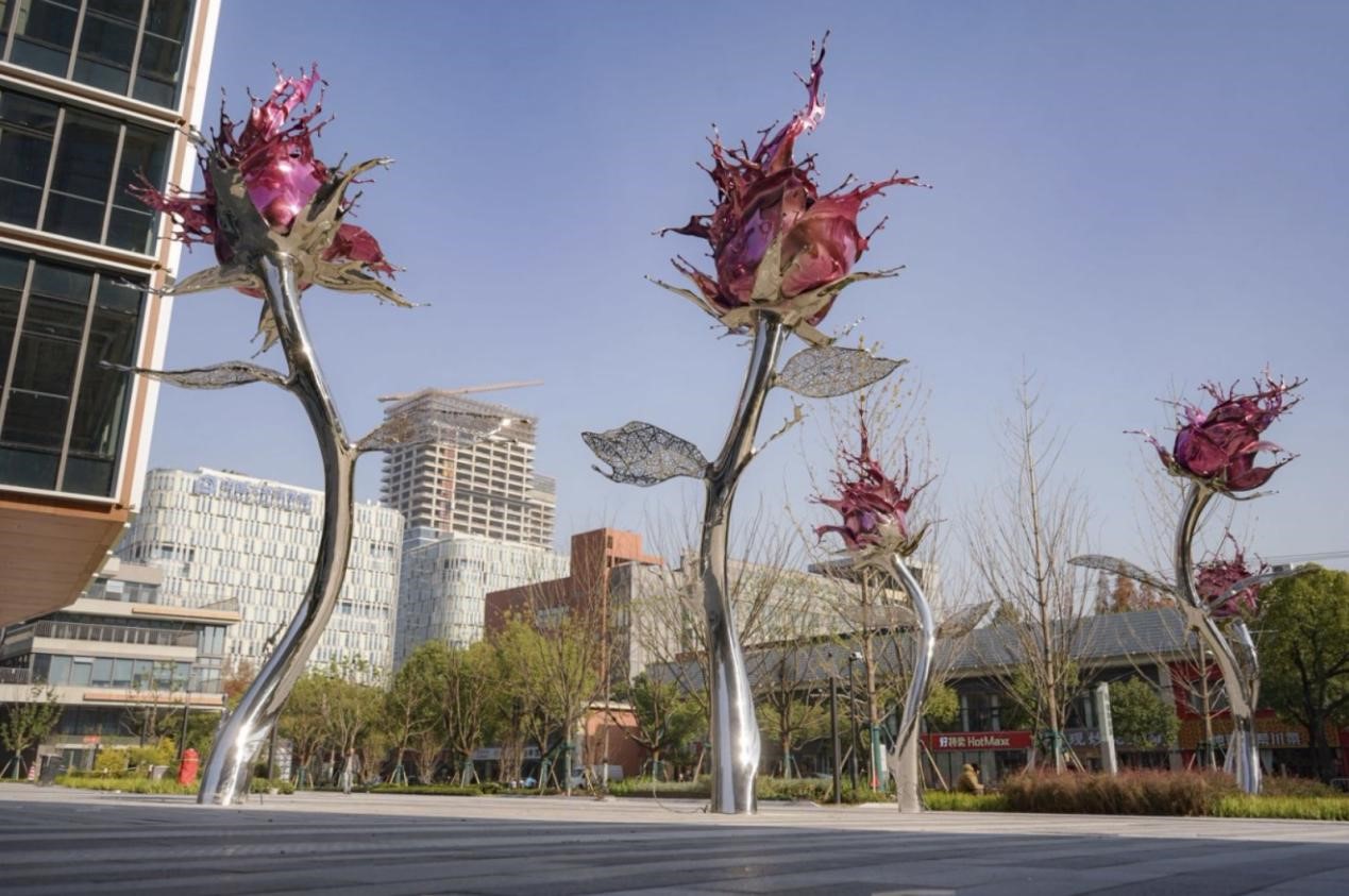 而在苍梧路入口的三角形广场上,中国当代艺术家郑路的《绽放的淋漓》则以绚烂的色彩和生动的形态,展现了生命的活力与美好。这不仅是郑路创作的第一件广场作品,也是他最大的城市公共艺术作品。