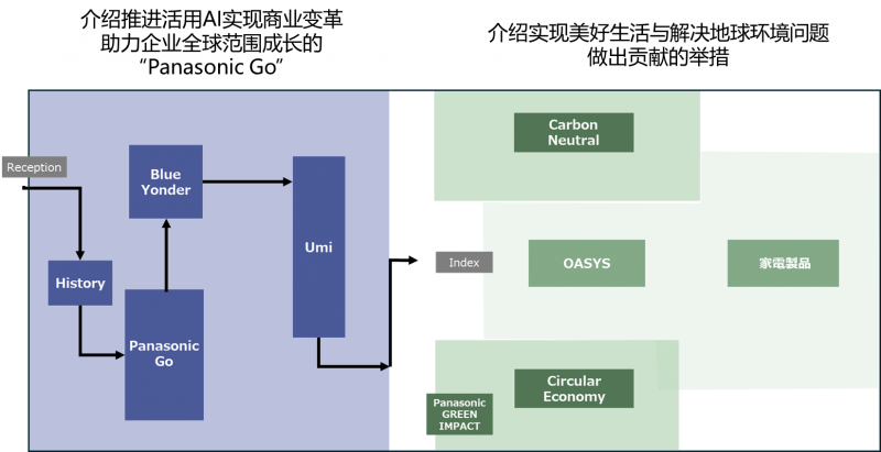 在展台的前半部分约总面积45%内,展示利用AI推动业务转型、助力企业在全球范围内成长的“Panasonic Go”理念和具体案例。后半部分则主要介绍为解决地球环境问题做贡献所提出的碳中和解决方案及循环经济解决方案,此外还展示了在北美推出的面向个人住宅的全屋空调系统“OASYS”和家电产品。