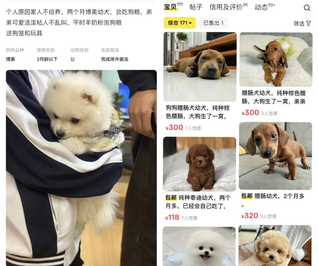 比如,在闲鱼或小红书平台中,不乏见到相似的文案:因出国、工作变动等无奈之举,家里的小猫小狗无法处置,低价售给好心人。
