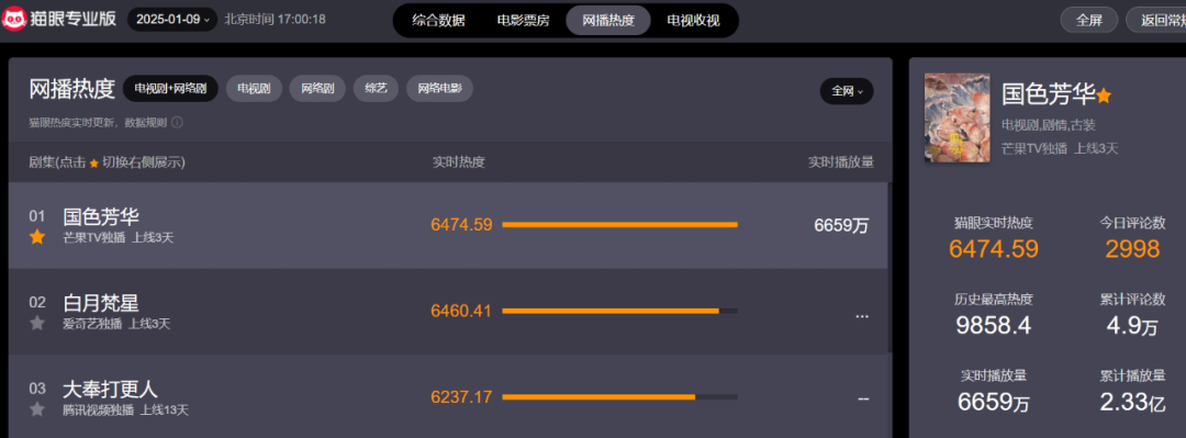 截至1月9日17:00,猫眼专业版数据显示,《国色芳华》实时热度仍居榜首,全网累计播放量已超2.3亿。