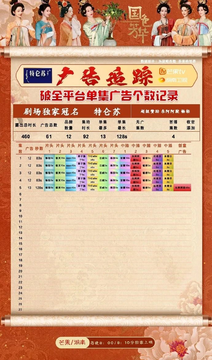 热情的除了观众,还有剧集的赞助商。除了总冠名“特仑苏”,芒果TV还为《国色芳华》开辟出了超级赞助的席位,分别由东阿阿胶和畅轻赞助。此外,据统计,《国色芳华》开播当晚放出的4集中,每集广告高达12个;第5-6集的广告增至13个。
